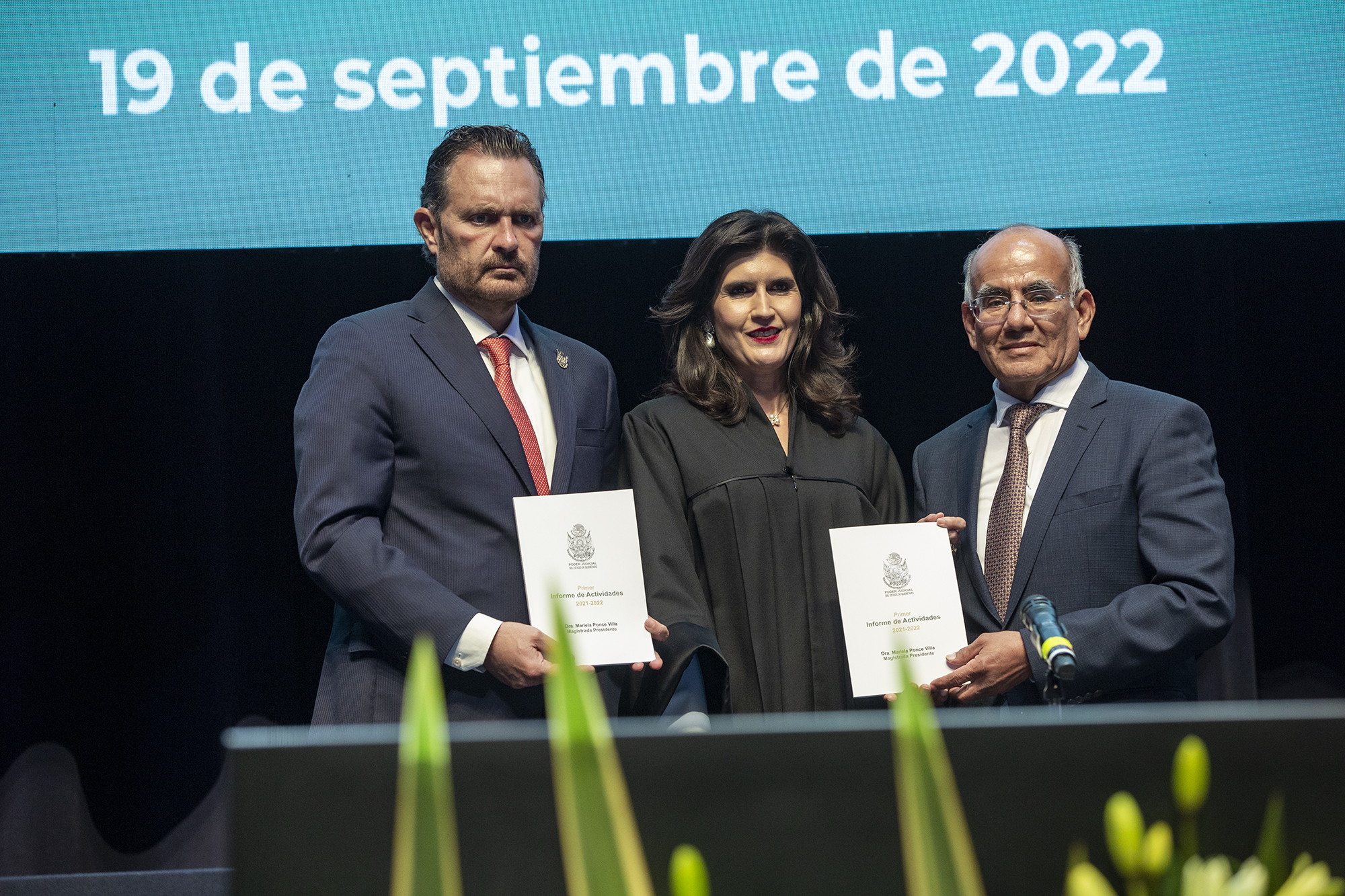 El gobernador, Mauricio Kuri González, acudió a la presentación del Primer Informe de Actividades 2021-2022 de la magistrada presidenta del Poder Judicial del Estado, Mariela Ponce Villa, quien detalló los principales logros y avances que permitieron el acceso efectivo a la justicia y el mejoramiento de las condiciones para otorgarla, a través del fortalecimiento institucional y la transparencia de los 78 juzgados distribuidos en todo el territorio queretano.