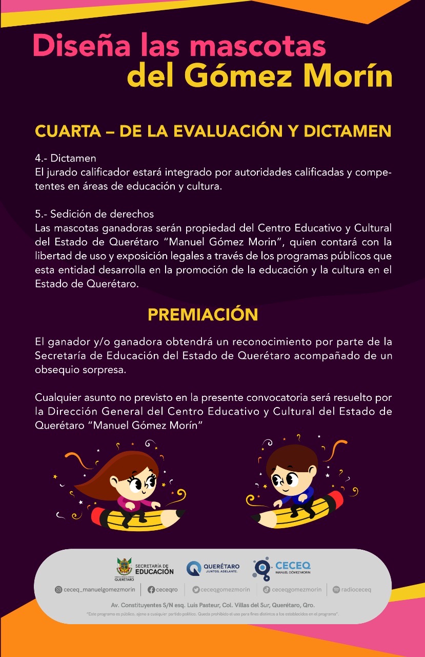 Con el objetivo decrear un lazo de cercanía y calidez que promueva valores de civilidad e integración en la entidad, el Centro Educativo y Cultural del Estado de Querétaro (CECEQ) y la Secretaría de Educación invitan a niñas, niños y jóvenes de seis a 24 años de edad a participar en la convocatoria “Diseña las mascotas del Gómez Morín”.