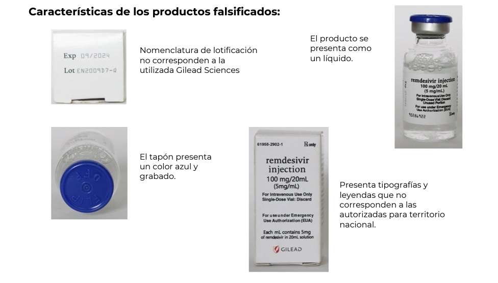 Los lotes EN2005A2-B, EN2009D7-Q, CM2022F5 y CA2023G5 del producto de Remdesivir no son reconocidos y se consideran como falsificados, indica la COFEPRIS.