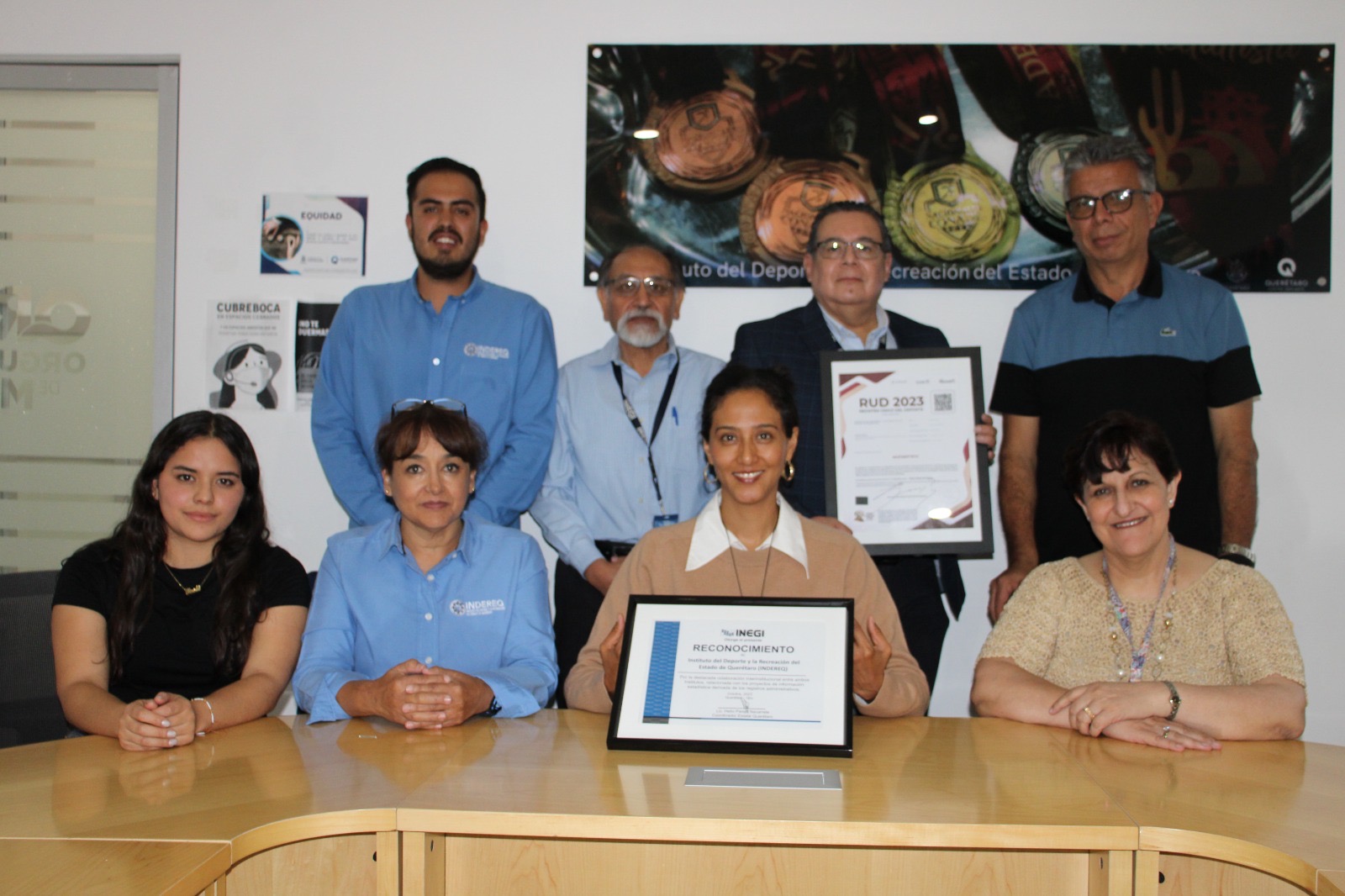 La directora general del Instituto del Deporte y la Recreación del Estado (INDEREQ), Iridia Salazar Blanco, recibió un reconocimiento por parte del personal de la delegación estatal del Instituto Nacional de Estadística y Geografía (INEGI) por la colaboración en la actualización de bases de datos de instalaciones deportivas.